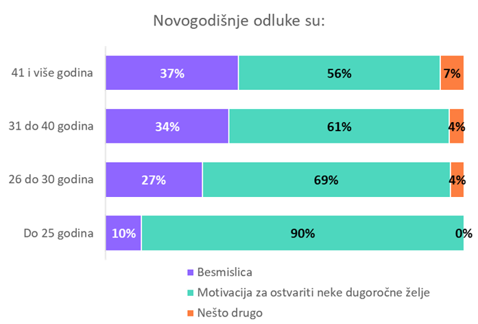 Novogodišnje odluke besmislenima češće smatraju muškarci (40%) nego žene (32%), kao i stariji ispitanici. Među mlađima prevladava optimizam i tek svaki deseti ispitanik mlađi od 25 godina smatra novogodišnje odluke nepotrebnima.