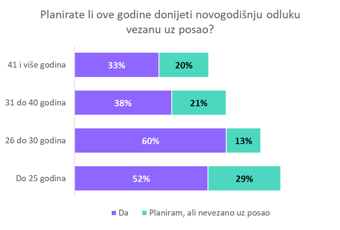 Kao i ranijih godina, novogodišnje odluke u velikoj su mjeri povezane s poslom i profesionalnim razvojem. Čak 66% odluka odnosi se na karijeru, što je gotovo identično prošlogodišnjem udjelu.