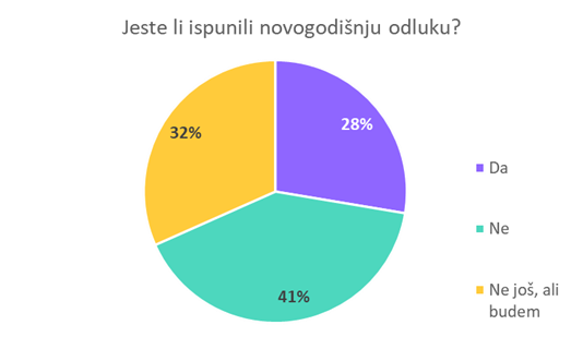 Na pitanje jesu li ispunili svoju prošlogodišnju odluku, 41% ispitanika odgovara da nije, dok ih 32% priznaje da još nisu, ali se nadaju da bi to mogli u budućnosti. Tek 28% ispitanika u potpunosti je ostvarilo svoju novogodišnju odluku.