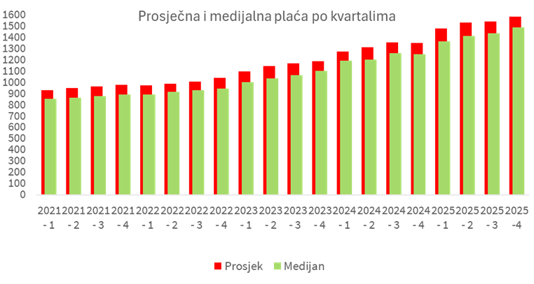 Medijalna plaća, koja bolje prikazuje stvarnu sliku primanja, iznosila je 1.430 eura. Drugim riječima, više od polovice zaposlenih prima plaću nižu od prosjeka. U odnosu na 2024. godinu, medijalna plaća porasla je 15%.