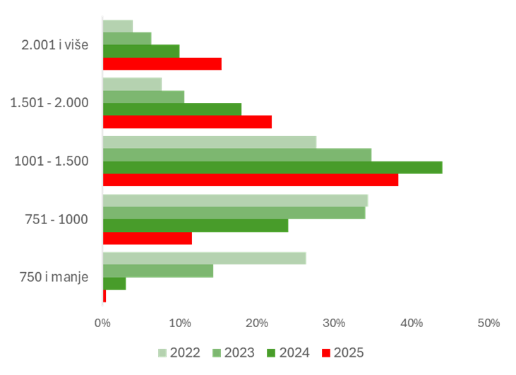 Najveći dio zaposlenih u Hrvatskoj, njih 38%, i dalje se nalazi u platnom razredu od 1.000 do 1.500 eura mjesečno. Ipak, u usporedbi s prošlom godinom, udio građana u tom rasponu osjetno se smanjio (lani 44%), što upućuje na postupni pomak prema višim primanjima.