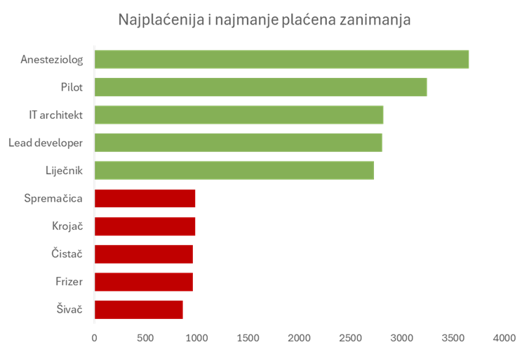 Na drugom kraju spektra, najpotplaćeniji radnici u Hrvatskoj su oni u uslužnim i pomoćnim zanimanjima. Šivači u prosjeku mjesečno zarađuju 864 eura, frizeri u prosjeku zarađuju 962 eura, čistači oko 963 eura, a krojači tek 984 eura mjesečno. Ispod prosjeka su i spremačice, koji primaju oko 984 eura.