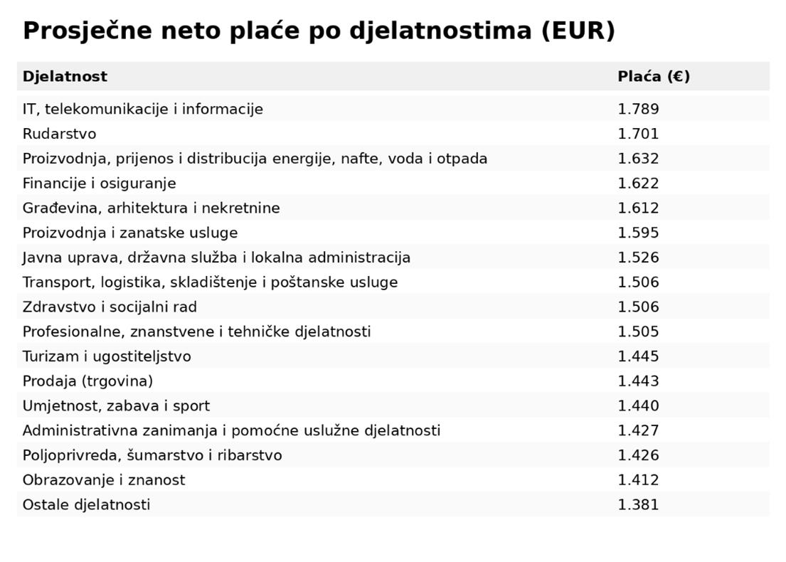 IT industrija i dalje drži vrh ljestvice po visini plaća. Prosječna primanja u tom sektoru iznose 1.789 eura, što je oko 16% iznad nacionalnog prosjeka.