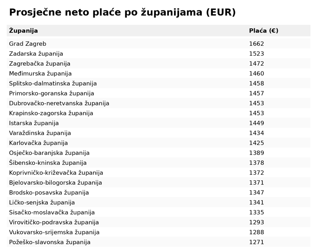 Najizraženiji rast plaća u odnosu na 2024. godinu zabilježen je u Krapinsko-zagorskoj županiji, gdje su prosječne neto plaće porasle za 20% i dosegnule 1.453 eura.
