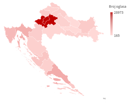 Čak dvije trećine oglasa za posao (63%) objavljenih u 2025. odnosilo se na rad u Zagrebu i Zagrebačkoj županiji, što potvrđuje dominantnu ulogu glavnog grada kao administrativnog, financijskog i poslovnog središta zemlje.