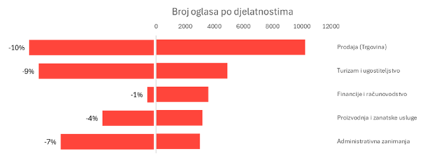 Prodaja zadržava vodeću poziciju s gotovo četvrtinom svih objavljenih natječaja. Turizam ostaje jedan od ključnih sektora, osobito u kontekstu hrvatskog gospodarstva koje se u velikoj mjeri oslanja na sezonsku potražnju i usluge.