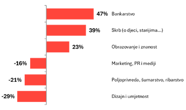 Najveći porast broja oglasa zabilježen je u Bankarstvu, gdje je potražnja porasla za čak 47% u odnosu na prethodnu godinu. Značajan rast bilježi i sektor Skrbi o djeci i starijima, gdje je broj oglasa povećan za 39%, kao i kategorija Obrazovanje i znanost, s povećanjem broja oglasa od 23%.